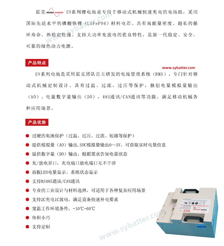 霍克 HAWKER EV系列動力電池,是先進水平的磷酸鐵鋰(LiFePO4)動力電池系統。具有能量密度高、循環壽命長、充放電性能優良、溫度性能好,是新一代高安全性、高可靠性的綠色電源。